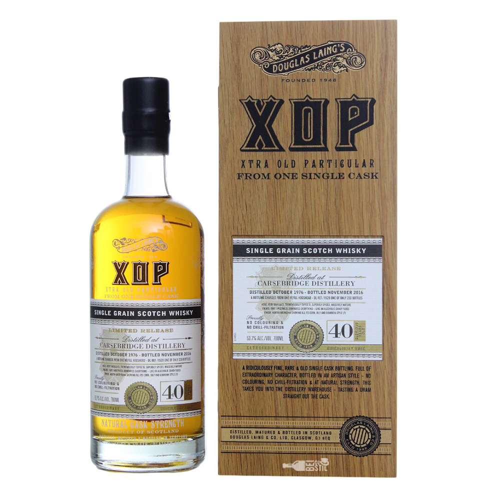 Carsebridge 40 Ani, parte din seria Xtra Old Particular a Douglas Laing, este o adevărată raritate. Distilat în 1976, acest single grain scotch whisky a petrecut patru decenii în butoaie refill hogshead înainte de a fi îmbuteliat în 2017. Cu o producție limitată la doar 148 de sticle, acest whisky unic aduce un omagiu distileriei Carsebridge, închisă în 1983, dar nemurită prin îmbutelierile independente de excepție.