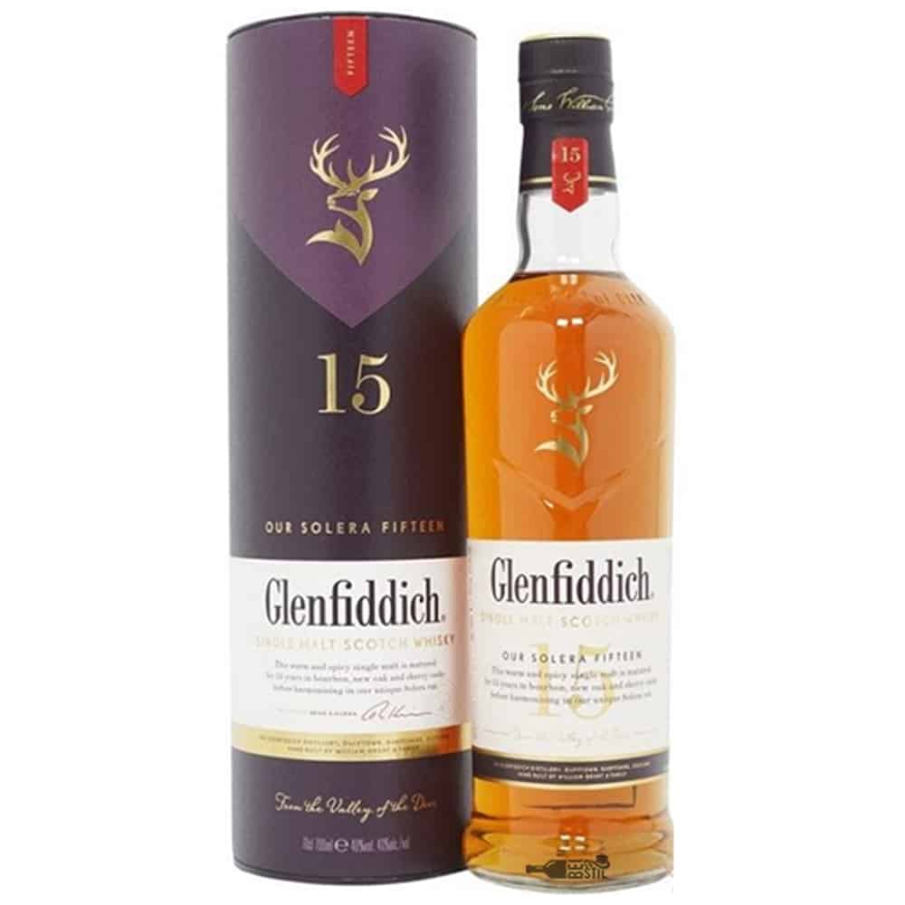 Elegantul sortiment Glenfiddich 15 ani Solera presupune amestecarea mai multor butoaie de single malt cu aceeasi varsta intr-un singur recipient.