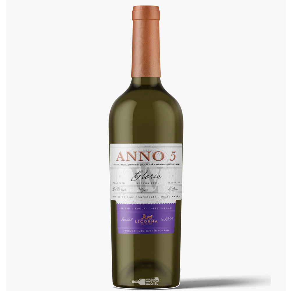 Licorna ANNO 5 Gloria 2024 este un vin alb sec maturat 4 luni în budane de stejar, un cupaj rafinat ce reunește Fetească Regală, Pinot Gris, Tămâioasă Românească, Fetească Albă – patru soiuri nobile românești și internaționale care își dau mâna într-un echilibru elegant și proaspăt. Fiecare înghițitură aduce în prim-plan arome florale și fructate, cu nuanțe fine de piersică albă, pere coapte, citrice și o atingere discretă de stejar, iar buchetul aromatic se completează cu note de miere, flori de câmp și ușoare condimente dulci. Textura este catifelată, aciditatea bine echilibrată, iar postgustul este lung, floral și ușor vanilat. Este un vin care își arată noblețea fie servit simplu, fie alături de preparate din pește, fructe de mare sau brânzeturi fine, fiind alegerea perfectă pentru cei care caută o experiență aromatică completă într-un singur pahar.