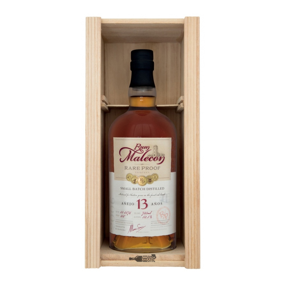 Malecon Rare Proof Rum 13 Ani este o bijuterie a distilatelor panameze, produs în ediție limitată, învechit timp de 13 ani în butoaie de stejar din 2009 și îmbuteliat la o tărie alcoolică de 50,5%. Acest rom oferă o experiență autentică, aproape ca direct din butoi, cu arome intense de fructe exotice, condimente și o notă subtilă de piele.