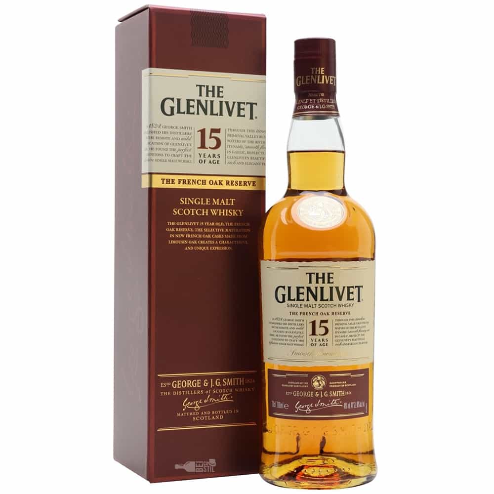 The Glenlivet 15 Ani – Caracterul distinctiv al acestui whisky cu o vechime de 15 ani este rezultatul maturarii selective; o parte din aceasta bautura spirtoasa este maturata intr-o selectie de butoaie de stejar francez pentru o perioada limitata de timp.