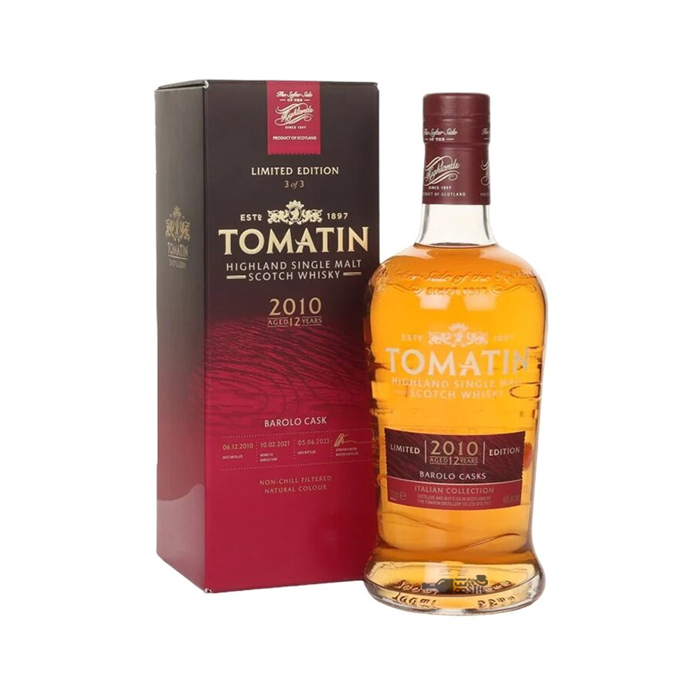 Tomatin Barolo Cask 2010, parte din colecția Italian Collection, combină caracterul Highland cu rafinamentul vinurilor Barolo din Piemont. Distilat pe 6 decembrie 2010, a stat 10 ani în butoaie de stejar și încă 2 ani în butoaie de Barolo, conturând un profil bogat, cu note de vin fiert, ciocolată neagră și fructe roșii coapte.